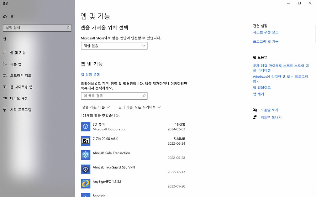설정 -> 앱 -> 프로그램 및 기능